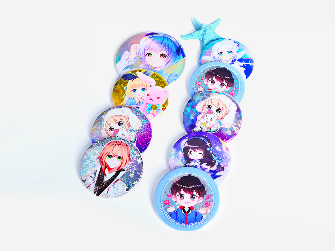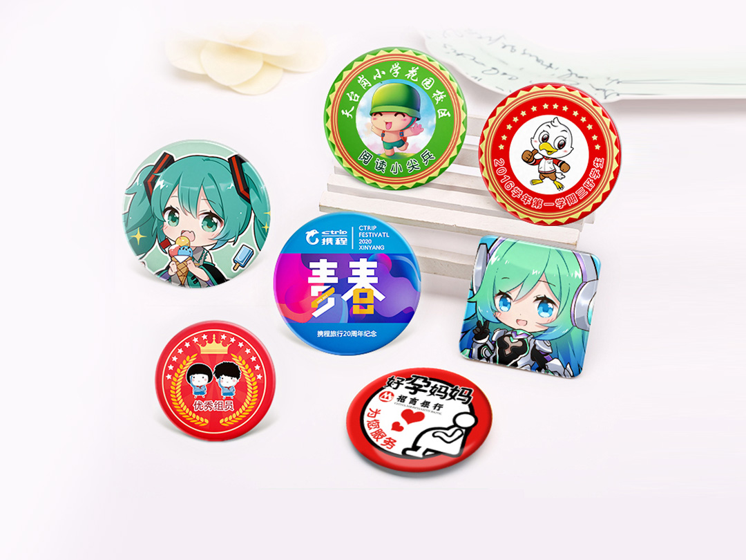 常用尺寸:44mm | 56mm | 58mm | 65mm | 75mm + 常用工艺:亮膜 | 磨砂 | 布纹 | 星幻 | 镭射 | 皮革 + 后盖形式:荷兰针 | 安全针 | 插卡 | 磁扣 +